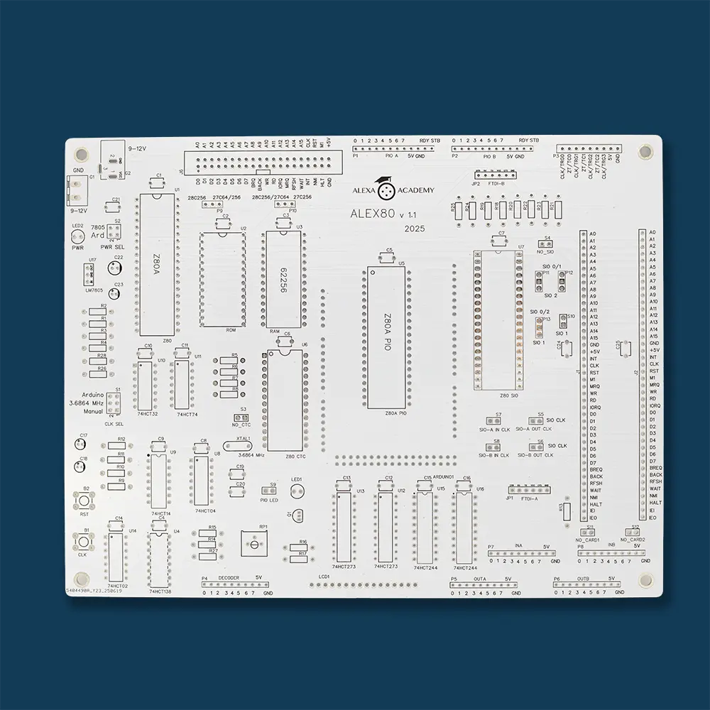 Alex80 è un sistema a scopo hobbistico e didattico basato sul microprocessore Z80. Il sistema completo con tutti i componenti permette la realizzazione di un piccolo home computer basato su Z80. E’ possibile (ma non necessario) aggiungere un Arduino MEGA per controllare il sistema e caricare programmi in memoria.